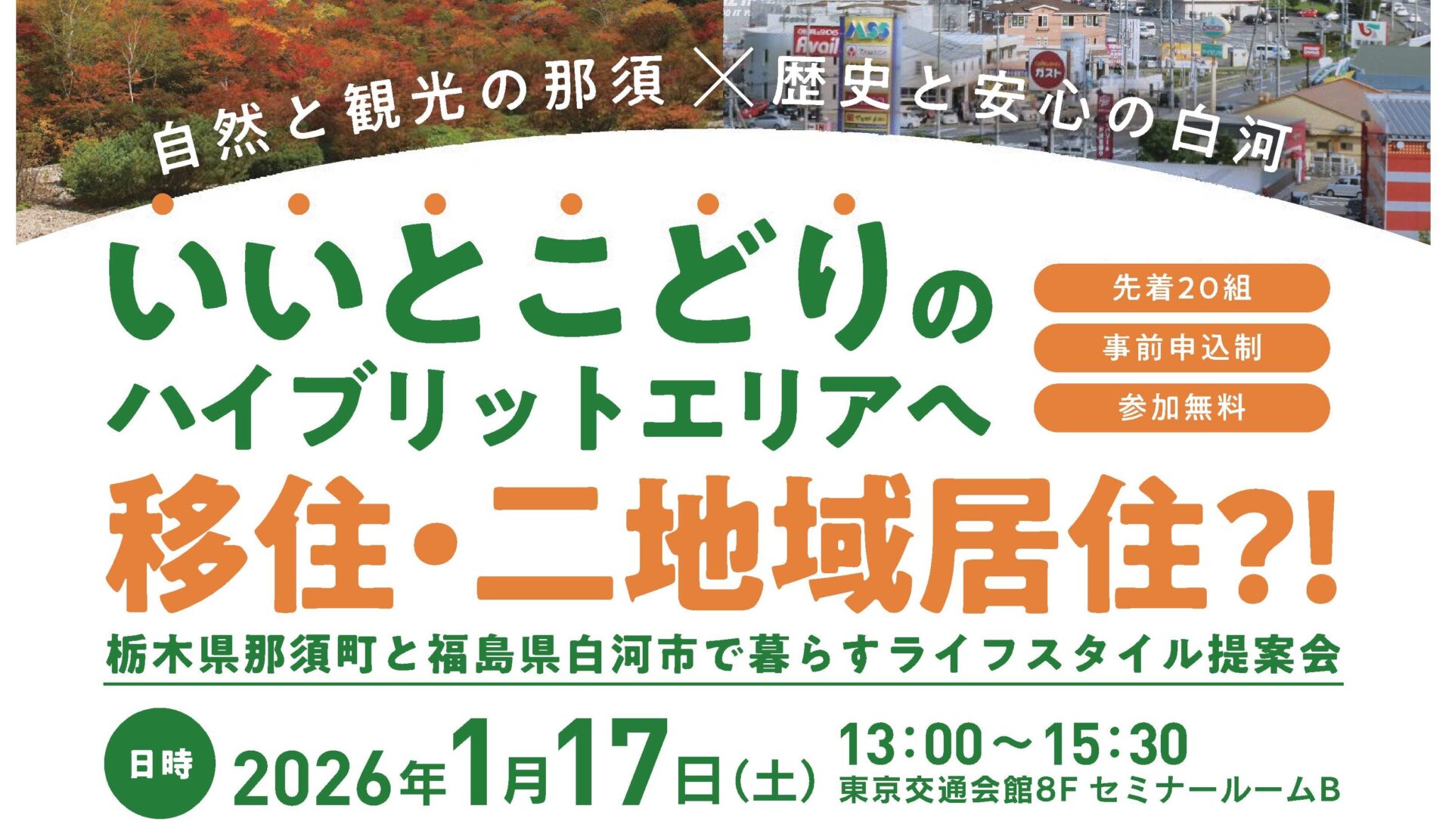 【2026年1月17日(土)】「栃木県那須町」×「福島県白河市」合同移住セミナー開催 in 東京(「那須町と白河市」で暮らすライフスタイル提案会)