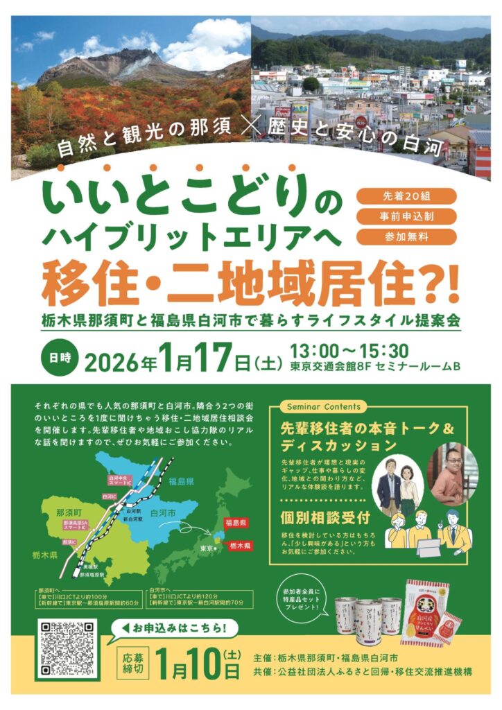 【2026年1月17日(土)】「栃木県那須町」×「福島県白河市」合同移住セミナー開催 in 東京(「那須町と白河市」で暮らすライフスタイル提案会)